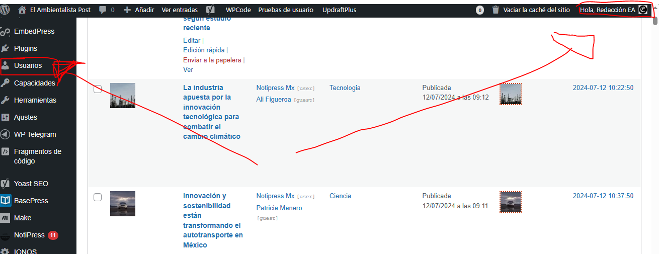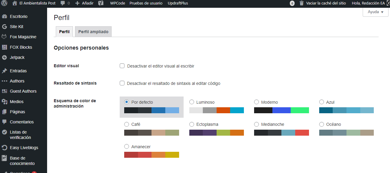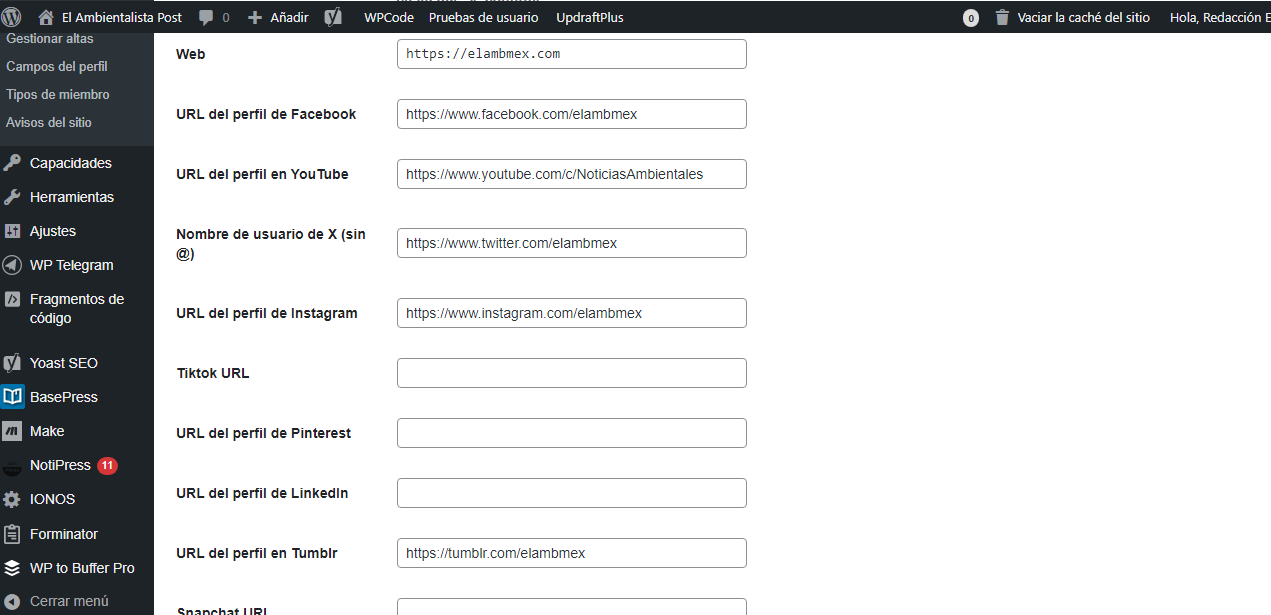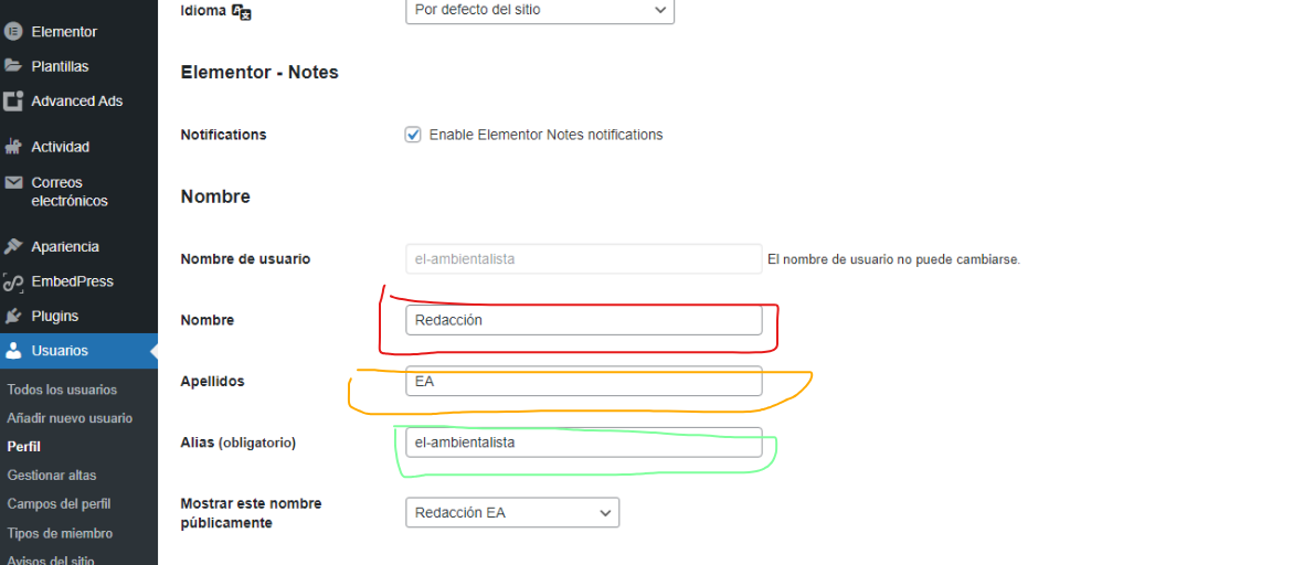 Puede hacerlo de dos formas, lo puede ir como aparece en la imagen de arriba. Con su sesión iniciada, visite: <https://elambmex.com/wp-admin/profile.php> , desde aquí podrá editar la información de su perfil mucho más fácil.&#x20;